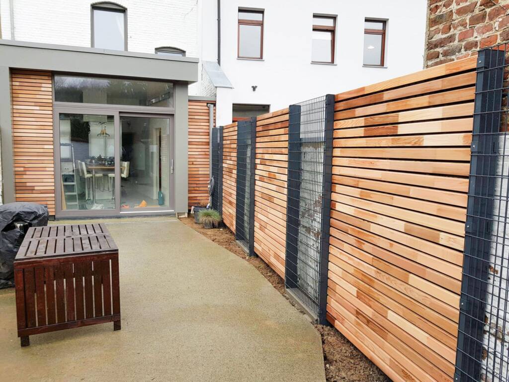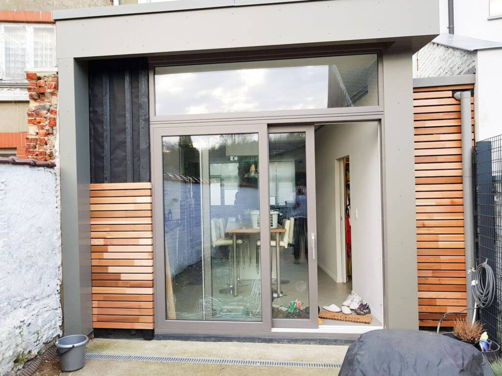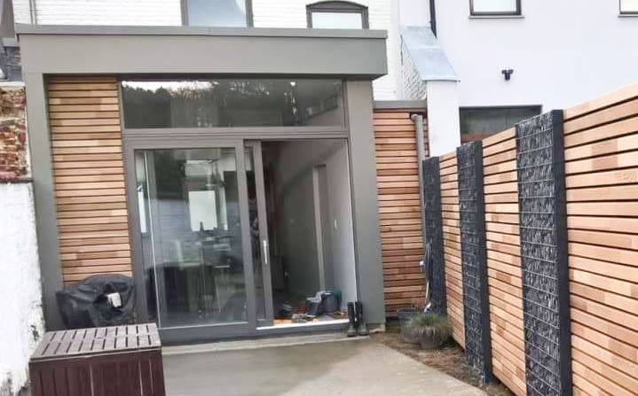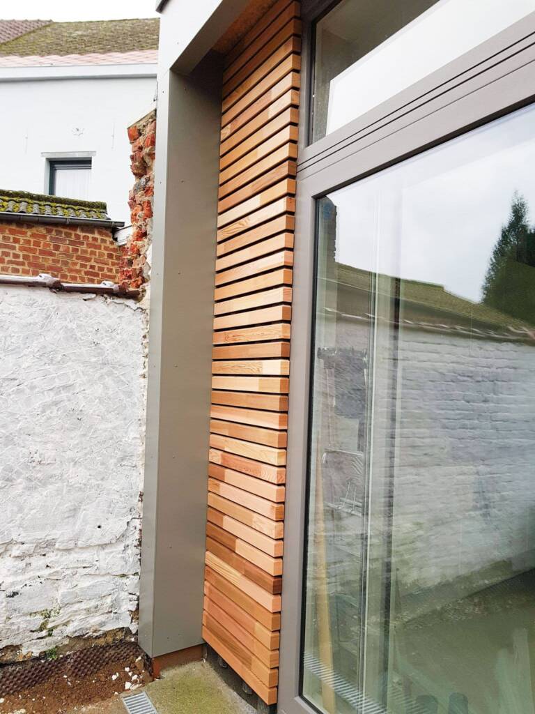 Les bandeaux de toiture ainsi que le mur mitoyen sont recouverts d’ue panneaux de fibre-ciment de même tête que les châssis afin de créer un ensemble cohérent tandis que les murs de façades, plutôt rares, sont recouverts d’un bardage bois ajouré et posé à l’horizontal qui contrebalance le côté vertical de la nouvelle volumétrie.