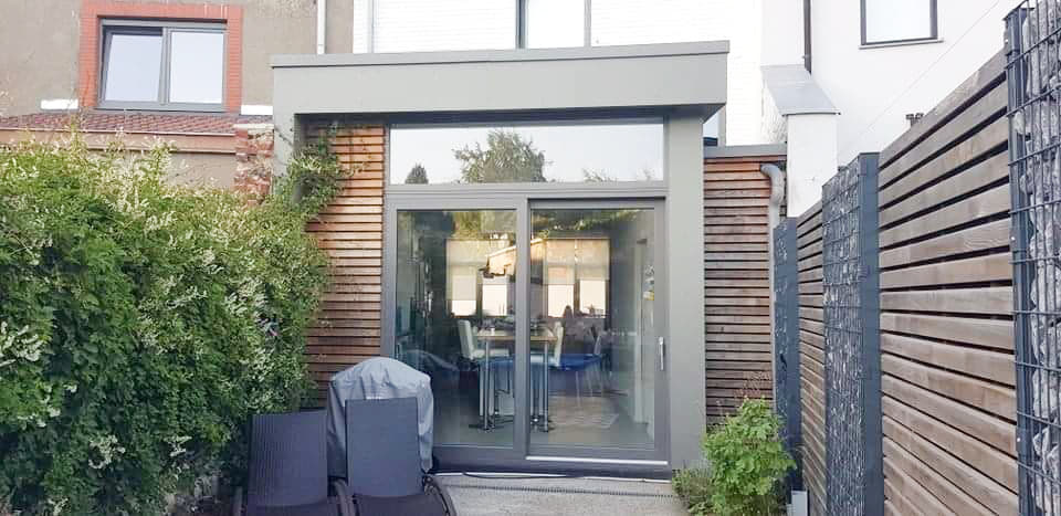 La nouvelle extension a été dissociée en un bloc technique reprenant les WC et la buanderie, plus bas et un bloc à vivre avec la nouvelle cuisine, plus haut.
